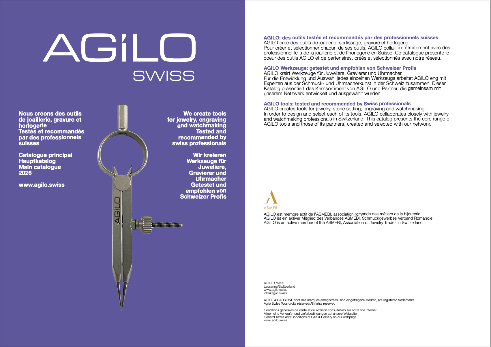 AGILO creates tools for jewelry, stone setting, engraving and watchmaking. In order to design and select each of its tools, AGILO collaborates closely with jewelry and watchmaking professionals in Switzerland. This catalog presents the core range of AGILO tools and those of its partners, created and selected with our network. For any question: info@agilo.swiss, +41(0)215257777